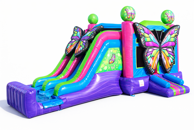 This inflatable features a stunning butterfly theme with bright purple, pink, teal, green, and blue colors that instantly stand out. Large 3D butterfly accents and rounded decorative tops create a magical look kids absolutely love.